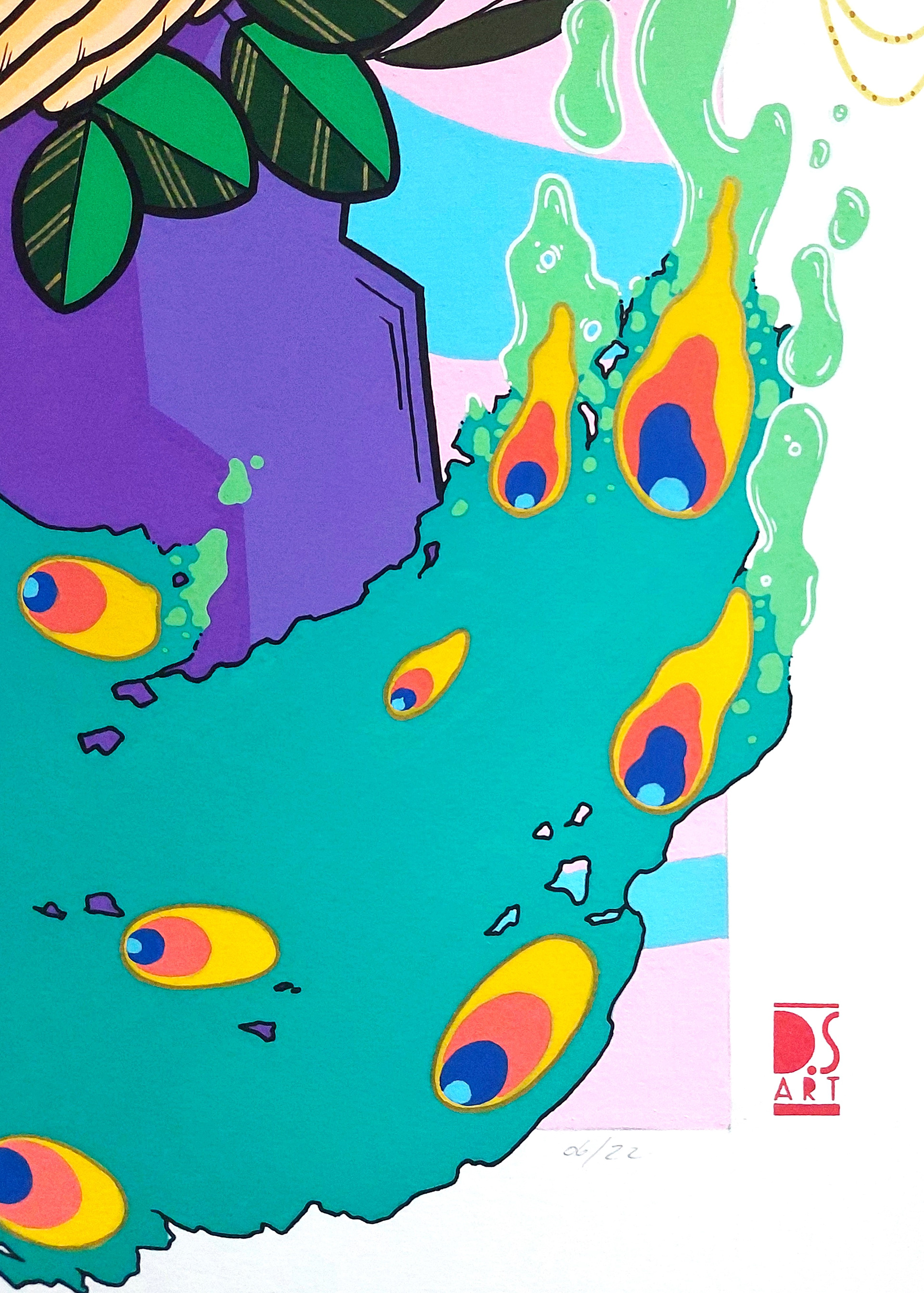 Please note, due to the piece being handpainted with Posca markers, colours may appear slightly fluorescent in the photos below.