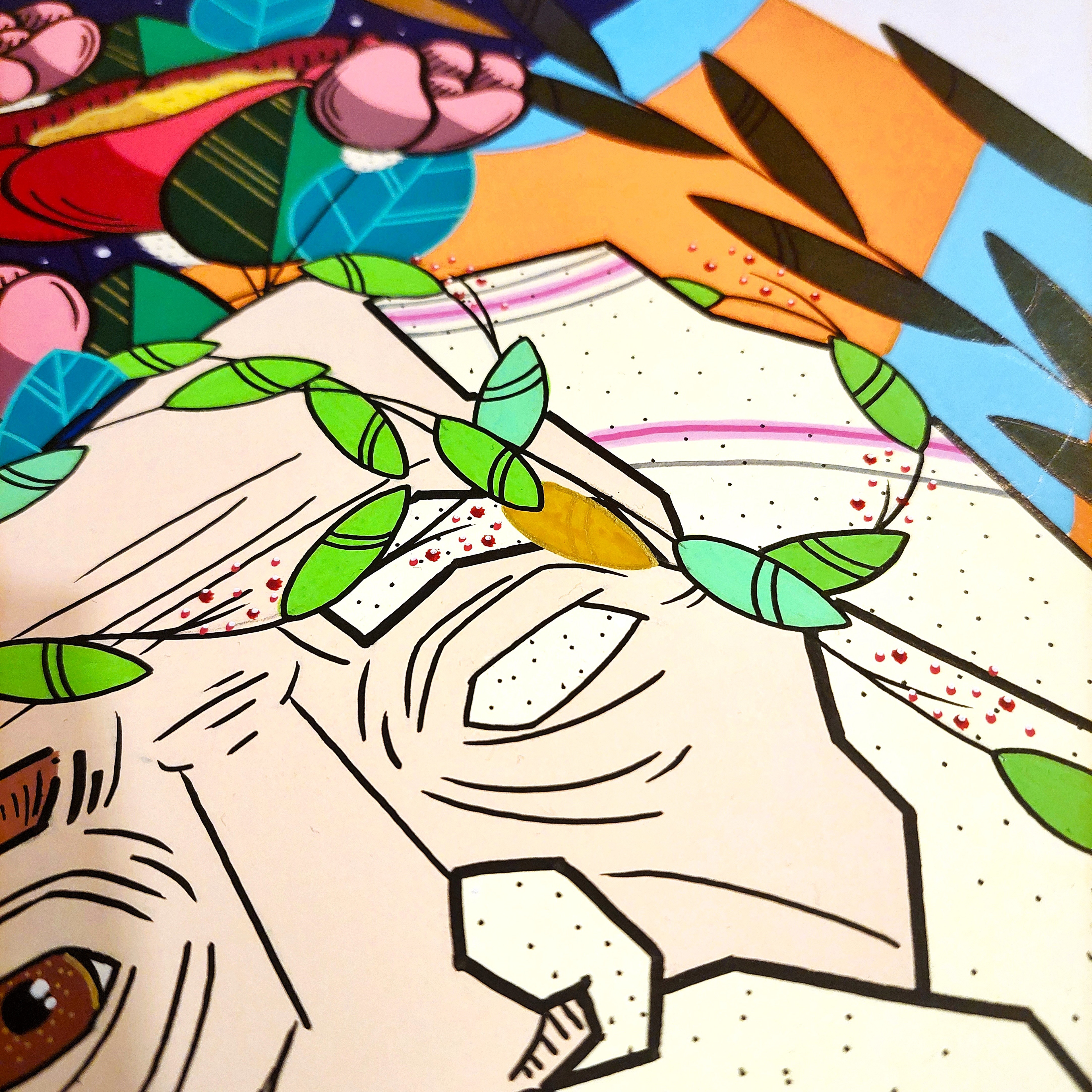 Please note, due to the piece being handpainted with Posca markers, colours may appear slightly fluorescent in the photos below.